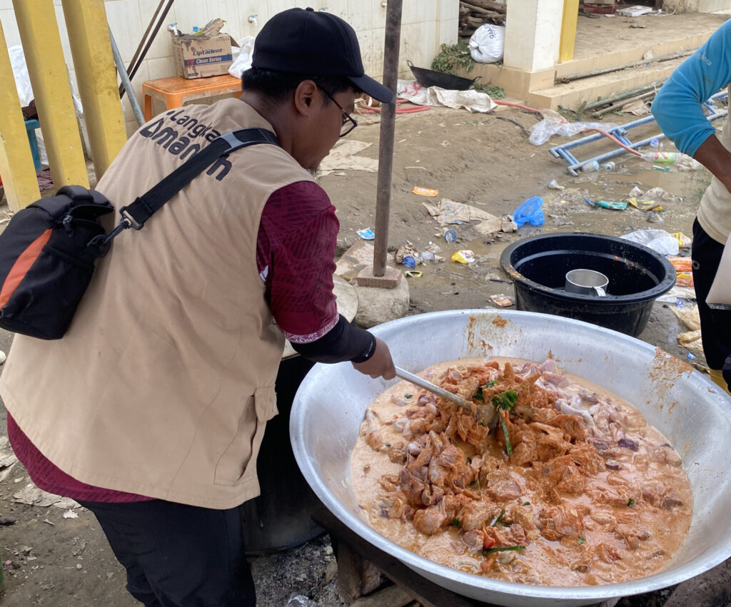 Sejak pagi hari, aktivitas dapur umum telah dimulai. Para relawan dengan penuh semangat menyiapkan bahan makanan, memasak, hingga memastikan setiap porsi layak dan siap untuk dibagikan. Di tengah keterbatasan sarana dan kondisi lapangan yang masih belum sepenuhnya stabil, proses memasak dilakukan dengan penuh kehati-hatian dan tanggung jawab, karena setiap porsi yang disiapkan merupakan amanah bagi mereka yang membutuhkan.